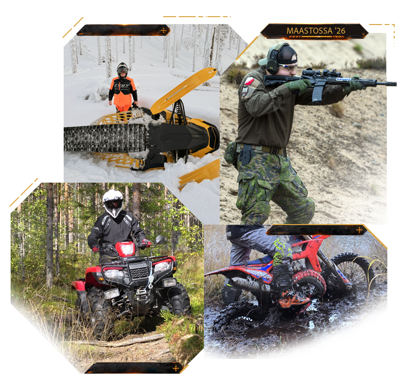 Varaa omalle joukkueellesi unohtumaton tapahtuma, jossa koulutamme sinut käsittelemään erilaisia maastoajoneuvoja. Taistelut eivät keliä katso ja kelissä kuin kelissä on päästävä paikasta toiseen. Talvella liikumme moottorikelkoilla, sulan maan aikaan mönkijöillä ja enduropyörillä. Tutustumme ajoneuvojen perustekniikkaan, ajamme metsäteitä pitkin sekä erilaisissa maastoissa, joissa pääset kokeilemaan rajojasi. Koulutus sisältää majoituksen, aamiaiset, kenttävälipalat, illallisen päivittäin, kaluston, ajovarusteet sekä ajokoulutuksen.